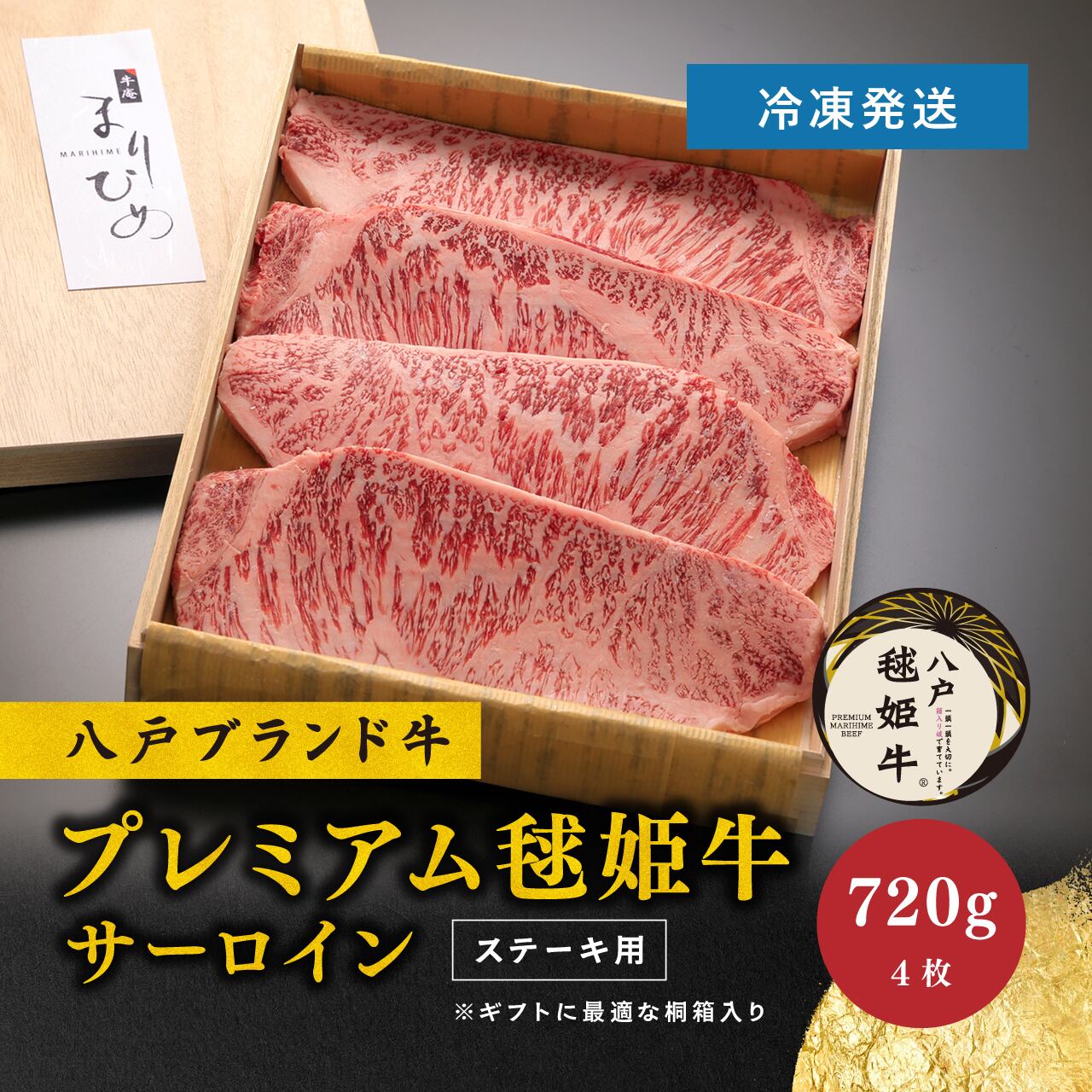 【冷凍】八戸 プレミアム毬姫牛[サーロイン180g×4枚]|ステーキ用|高級ギフト 桐箱入り|牛庵まりひめ ※【冷凍便】発送/常温商品の同梱不可